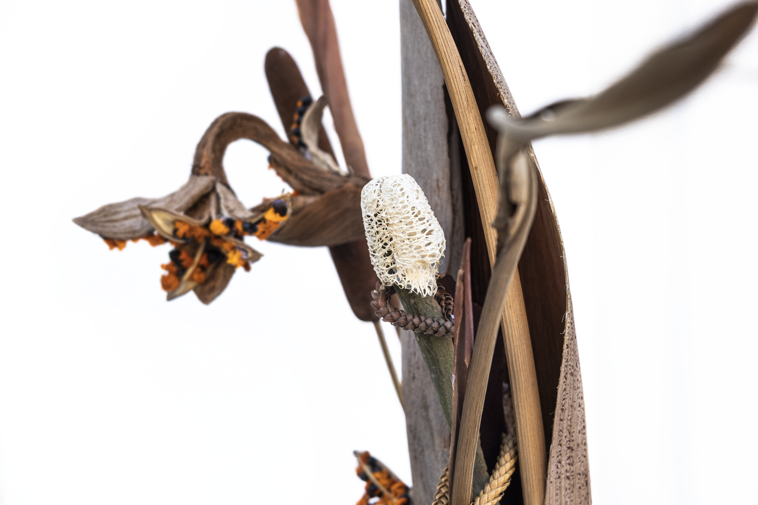 Abstract pieces combine contrasting textures like the softness of petals and fibers with the ruggedness of stone, bark, and wood.
