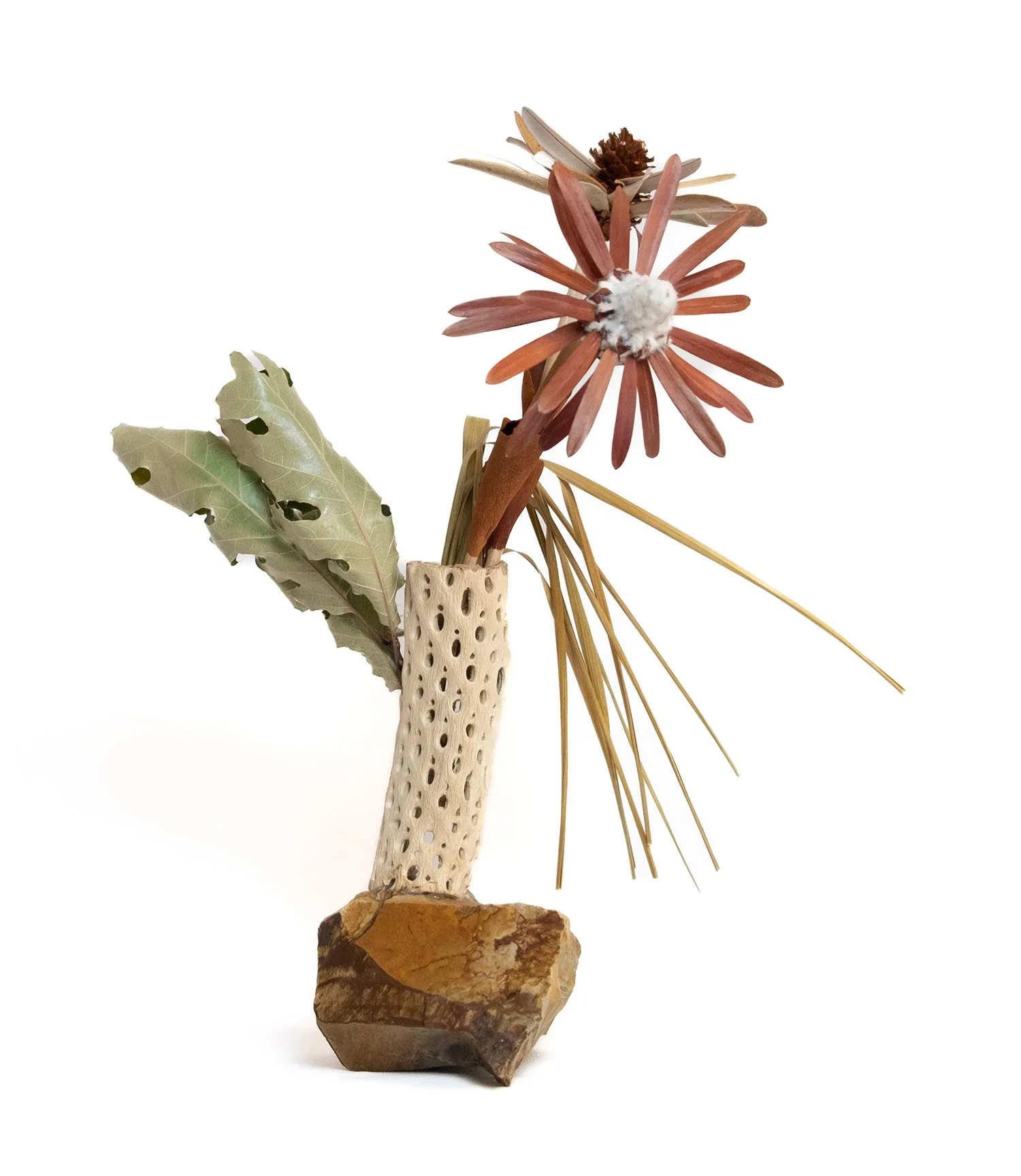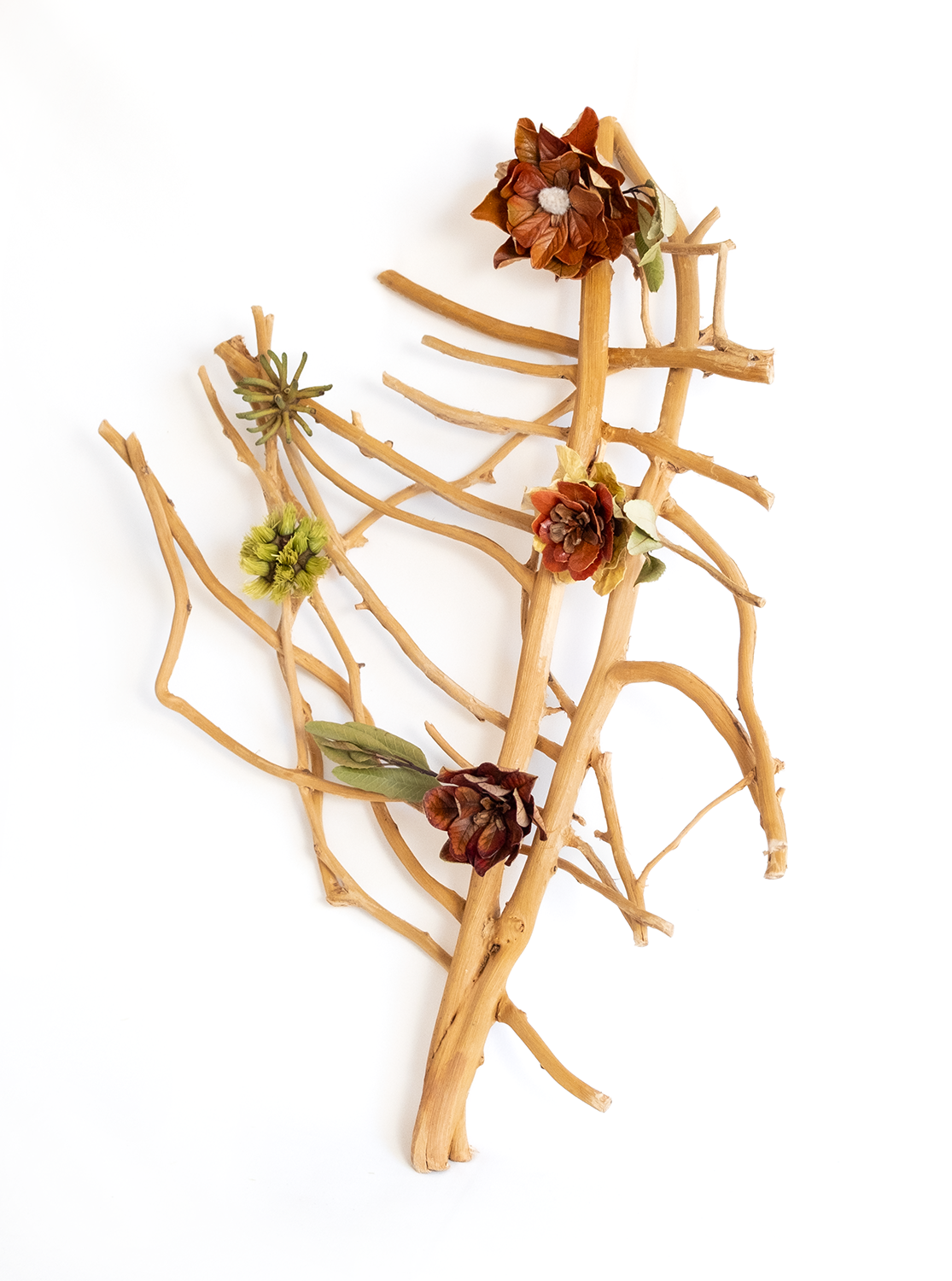 These flowers are crafted entirely from leaves gathered from different trees and shrubs, shaped and arranged to resemble natural blossoms. Some leaves come from plants that have dried under the full intensity of the sun, giving them a crisp texture and earthy tones. Others are collected from the shade, where they retain softer hues and more delicate surfaces. At times, fresh leaves are also used and left to dry naturally so their color and form can be preserved.