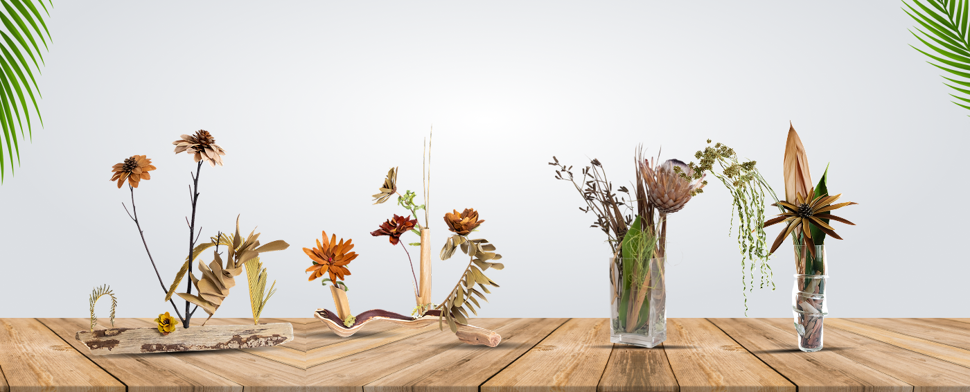 Dark stem rises on a weathered piece of driftwood, holding crafted floral forms, and elongated golden leaves of cardboard palm. At the base, a small yellow flower composed from mistletoe, a hemi parasitic plant with thick and leathery leaves.
