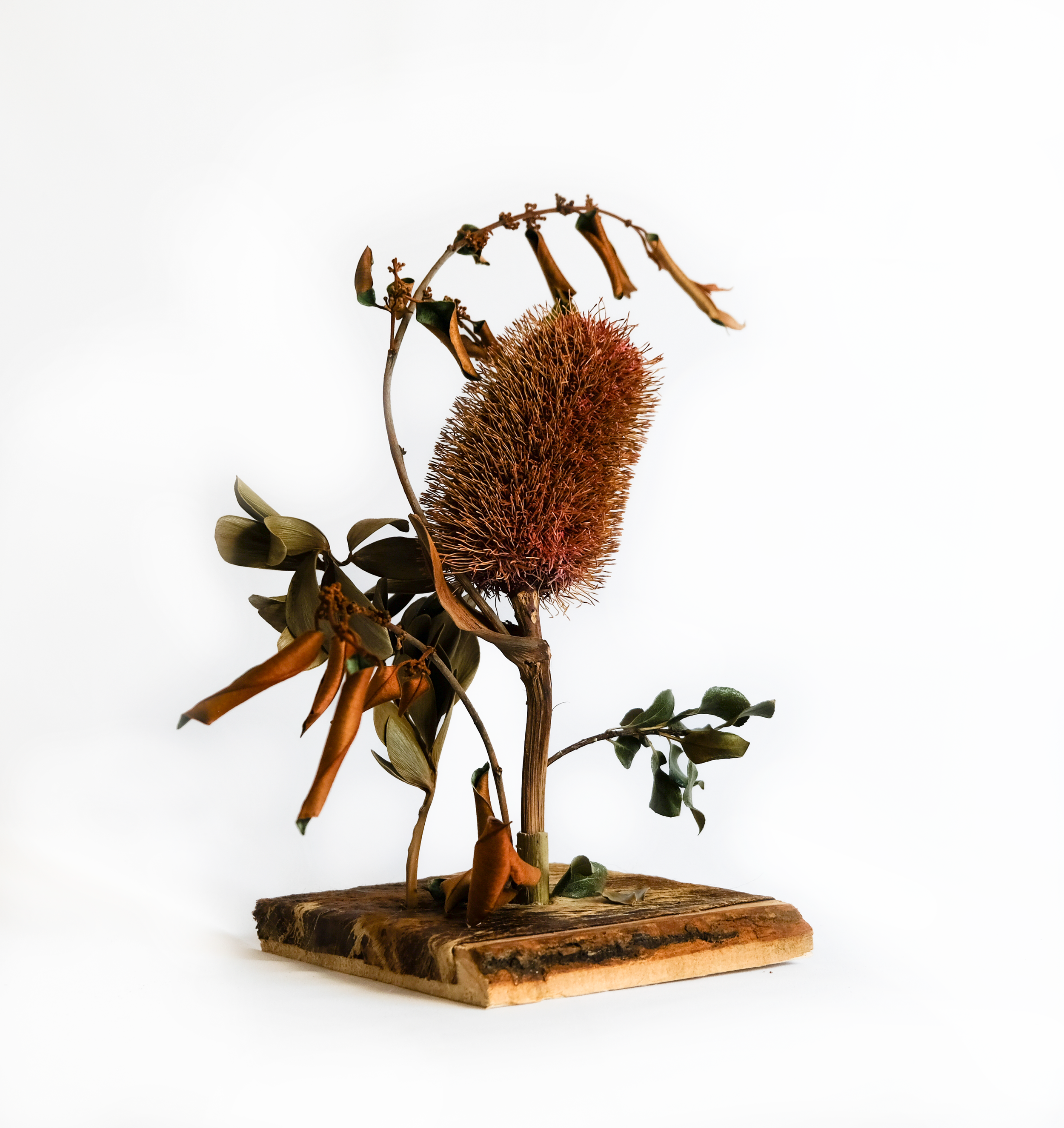 Explore delicate botanical sculptures where wood, stone, and preserved leaves come together in subtle harmony.