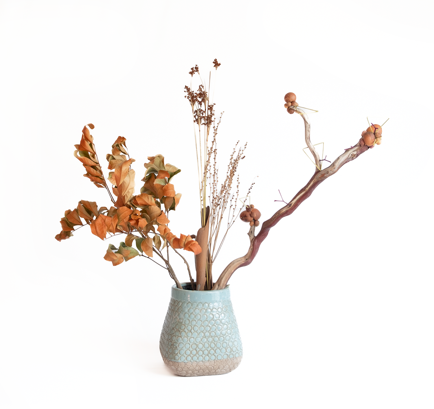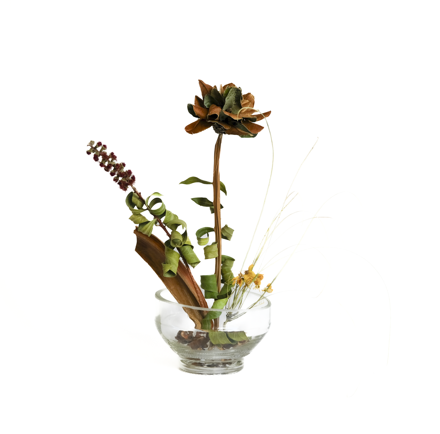 Fragments of nature rest within vessels of glass and clay to form sculptural compositions. These pieces explore the connection between nature’s elements and the objects we create to hold them.
